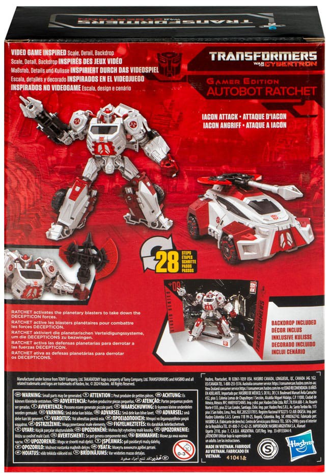Bring the epic action from the Transformers video games into your collection with the Transformers Studio Series Voyager Class 09 Gamer Edition Ratchet action figure, inspired by the Transformers: War for Cybertron video game! Transformers Studio Series Gamer Edition toys are collectible action figures that feature video game-inspired details and accessories. Convert the Studio Series Transformers action figure from robot to Cybertronian sports car mode in 28 steps and pose the Ratchet toy in the included Iacon Attack removable backdrop scene. Look for more Transformers Studio Series Gamer Edition collectible figures to build a video game-inspired collection.