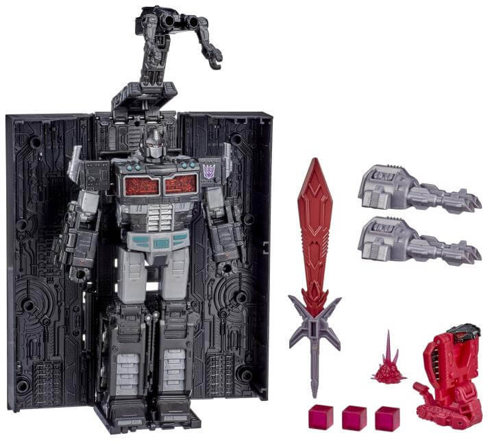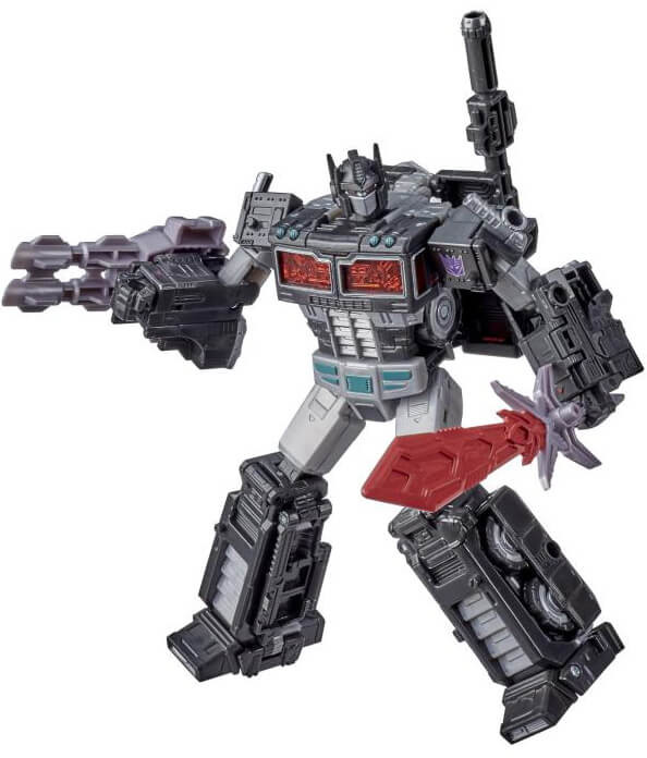 This Nemesis Prime figure is inspired by the character as seen in the War for Cybertron series. With 63 deco ops, this series-inspired figure brings fans the most detailed and series-accurate version of the character. Nemesis Prime converts to vehicle mode in 34 steps, while the included Battle Masters Sliterfang figure converts to weapon mode in 6 steps.