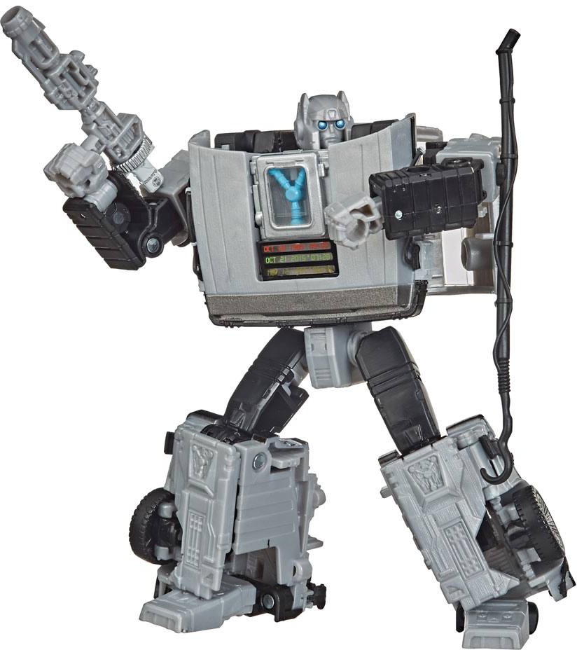 When Marty and Doc Brown need a ride through time, Gigawatt is ready to fly! This Gigawatt figure features movie-inspired details inspired by the Back to the Future film, including Doc Brown-style goggles, a flux capacitor chest piece, and time circuits. In time machine mode, the gullwing doors open and his wheels rotate to produce a hovering effect as seen onscreen. Also includes blaster and whip antennae accessories. Converts from robot to time machine mode in 17 steps.