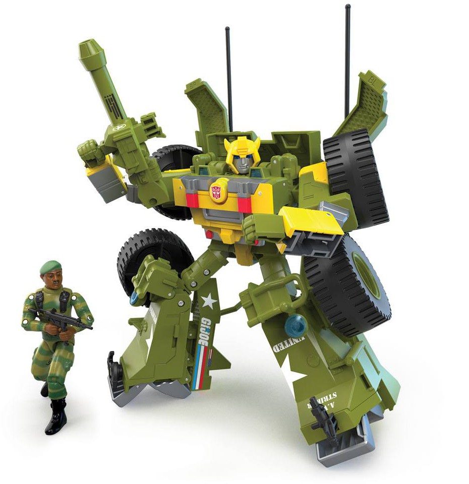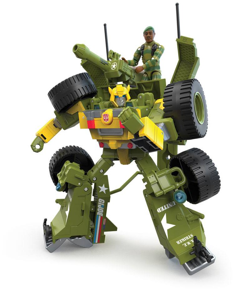 Worlds collide in this Transformers-G.I. Joe mash-up pack! G.I. Joe and the Autobots team up to protect the world! Stalker and Bumblebee, disguised as an A.W.E. Striker, scout out Cobra-Decepticon strongholds. The Bumblebee A.W.E. Striker toy converts from robot to A.W.E. Striker mode in 21 steps and comes with the G.I. Joe Retro Lonzo 'Stalker' Wilkinson figure. Figures feature deco and details based on the worlds of Transformers and G.I. Joe. Includes cannon and weapon accessories. Accurate scale to the 1985 A.W.E. Striker toy. Packaging is inspired by a mash-up of the classic '80s toys with retro artwork. Lonzo 'Stalker' Wilkinson toy comes on a card back with file card.