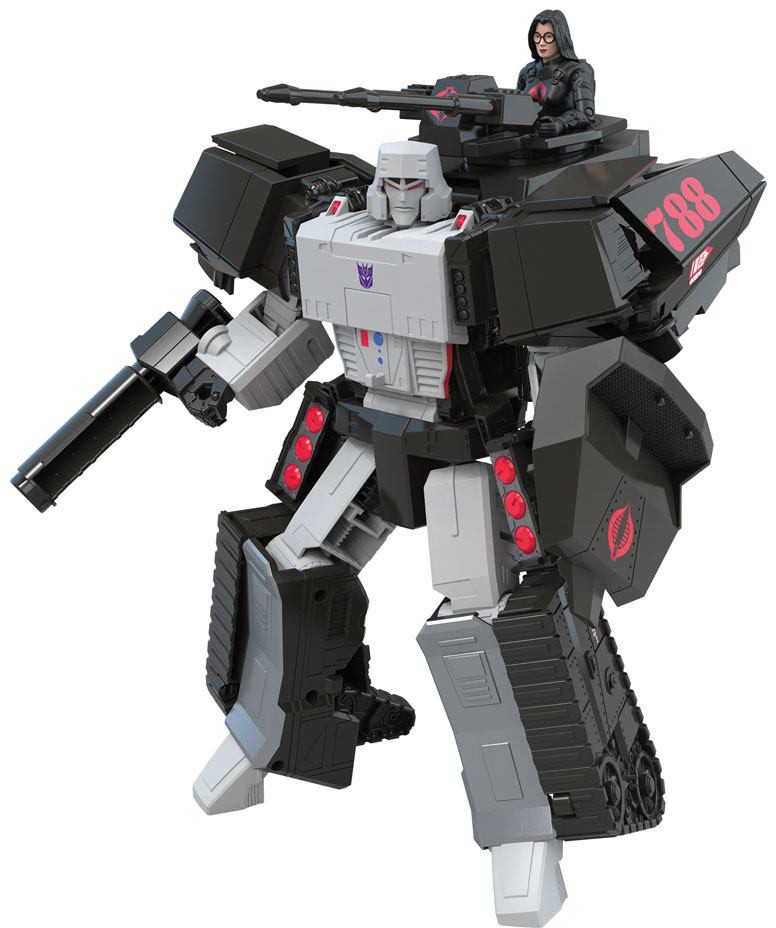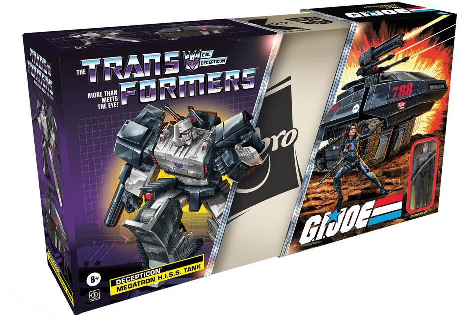 Världar kolliderar i denna Transformers - G.I. Joe mash-up pack! Decepticons och Cobra går ihop för att erövra världen! The Baroness och Megatron, förklädd till en H.I.S.S. Tank, planerar nästa Cobra-attack. Megatron H.I.S.S. Tank konverterar från robot till stridsvagnsläge i 28 steg och kommer med G.I. Joe Retro Baroness-actionfigur. Båda figurerna har deco och detaljer baserade på Transformers och G.I. Joe. Packet inkluderar en fusionskanon, ryggsäck och vapentillbehör. Figuren är i samma storlek som 1983 års H.I.S.S. Tank-leksak. Baronessans figur passar i tornet i H.I.S.S. tankfordonsläge. Förpackningen är inspirerad av en mix av klassiska 80-talsleksaker med retrokonstverk. Baronessfiguren kommer på ett blisterkort.
