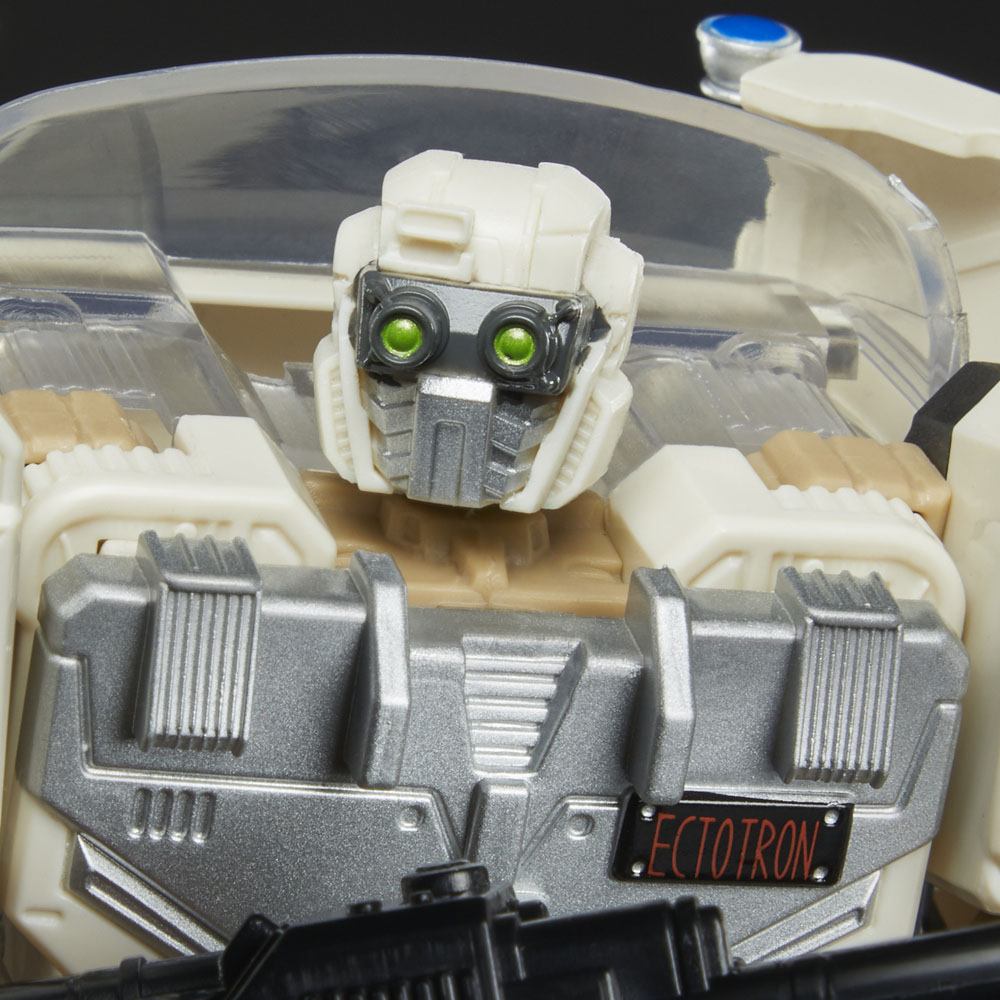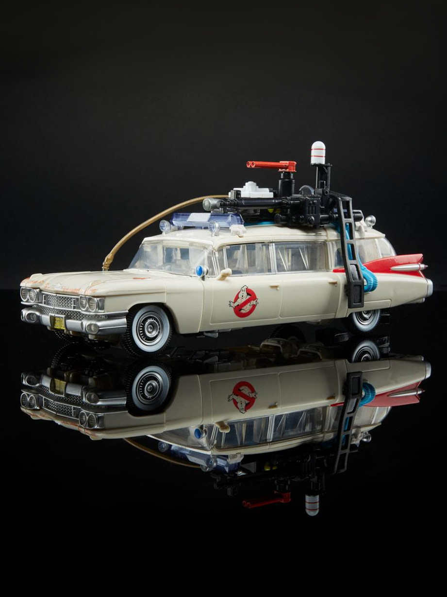The iconic Ecto-1 Cadillac from the Ghostbusters: Afterlife movie is now a Transformers robot called Ectotron! The Ectotron figure converts between Ecto-1 and robot modes in 22 steps, and comes with a Proton Pack and Blaster accessories, Slimer and Muncher ghost figures, and issue number 1 of the Transformers Ghostbusters Ghosts of Cybertron comic book from IDW Publishing, featuring an exclusive cover. The figure also features an updated head sculpt inspired by Ghostbusters: Afterlife.