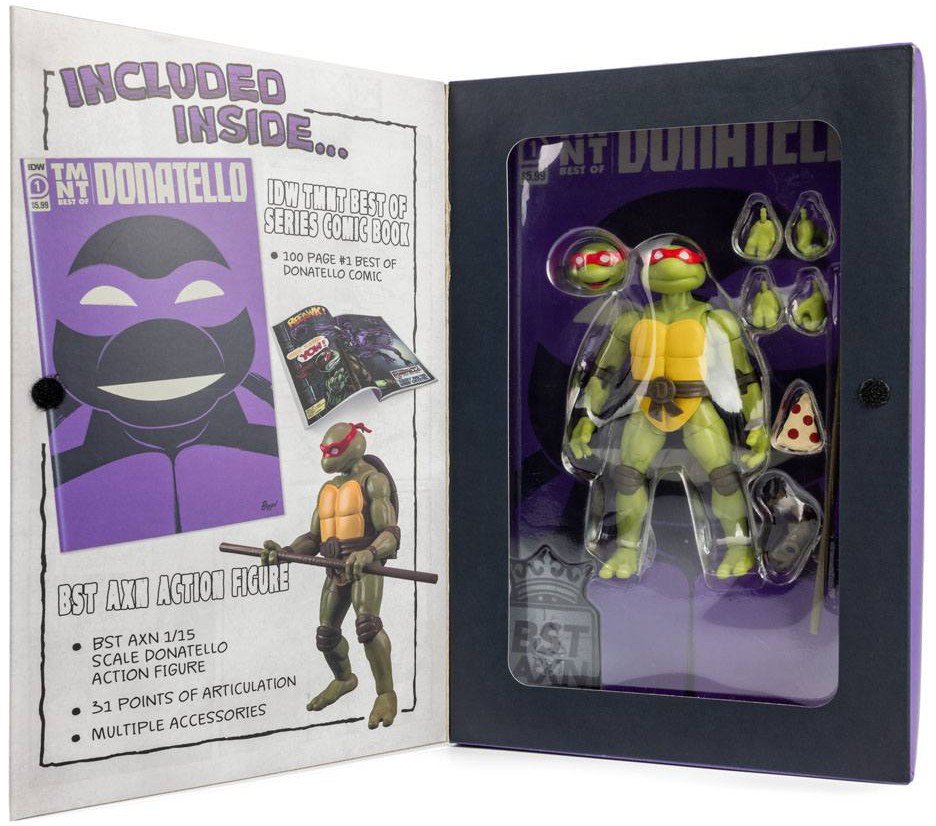 The Loyal Subjects has teamed up with IDW to create a Teenage Mutant Ninja Turtles BST AXN x IDW action figure and comic book bundle! An IDW inspired colorway of all four BST AXN Teenage Mutant Ninja Turtles with an accompanying IDW book (100 pages compiled from four different comics)! Each of the four book covers adorns the portrait of one of the TMNT heroes, and accompanies the correlating BST AXN figure; i.e. Raphael IDW book cover will accompany the Raphael BST AXN figure. All four comic book compilations are different.