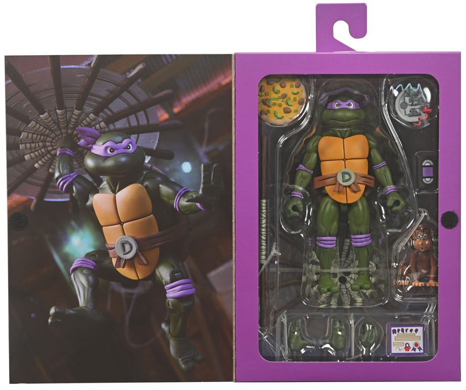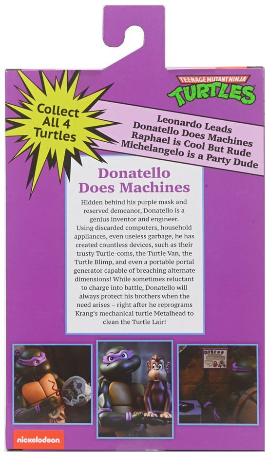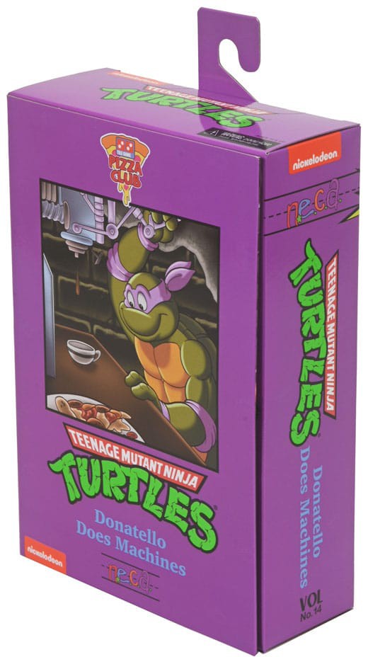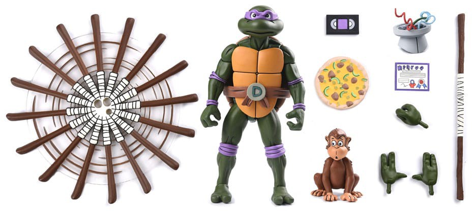Based on the classic 1980s Teenage Mutant Ninja Turtles cartoon series! Donatello does machines and is getting the "Ultimate" treatment with this 7-inch scale action figure loaded with accessories. He's got a spinning bo staff-necessary to knock out the Shredder and the Foot Clan-plus a pickles & avocado pizza, peanut butter, and more episode-specific accessories! Also included is a bonus Roadkill Rodney head that is compatible with the previously released Roadkill Rodney figure! Comes in all-new Pizza Club VHS style collectible packaging.