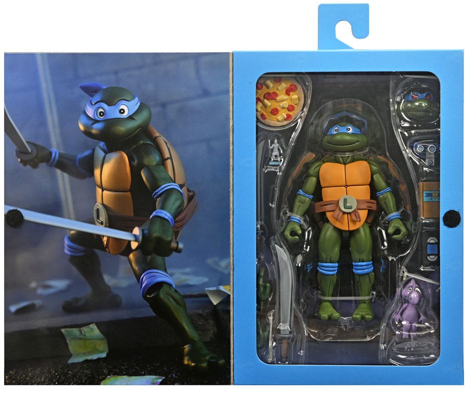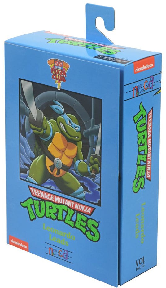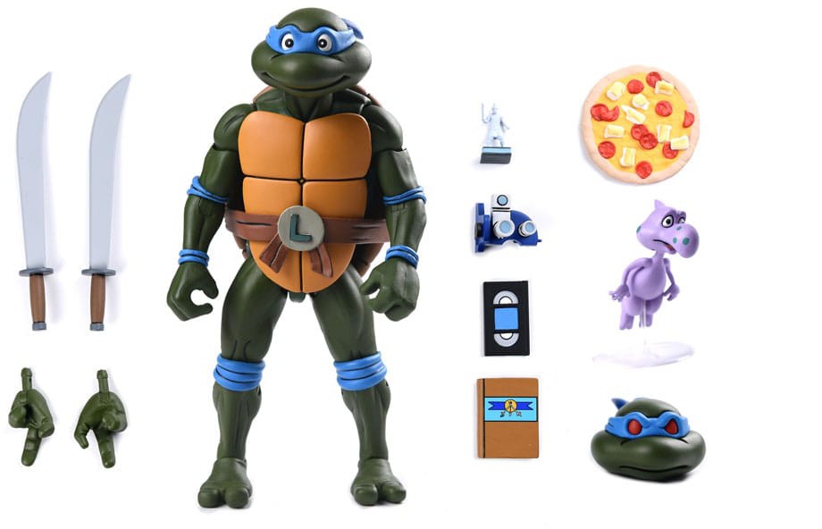 Based on the classic 1980s Teenage Mutant Ninja Turtles cartoon series! Leonardo leads and is getting the "Ultimate" treatment with this 7-inch scale action figure loaded with accessories. He includes an evil robot clone head from the episode "Combatland," plus a pepperoni & marshmallow pizza, and more episode-specific accessories! Comes in all-new Pizza Club VHS style collectible packaging.