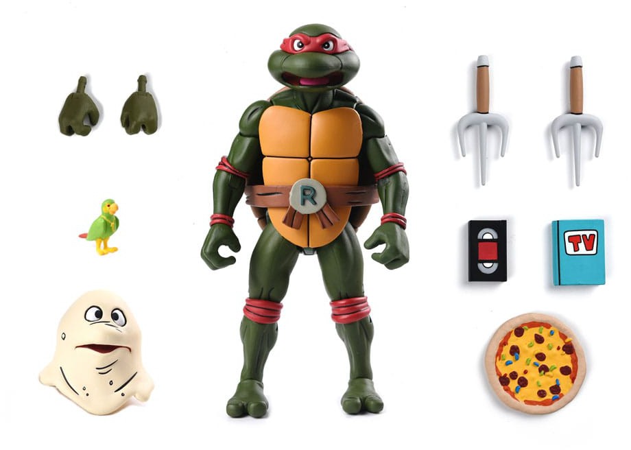 Based on the classic 1980s Teenage Mutant Ninja Turtles cartoon series! The party dude Michelangelo is getting the "Ultimate" treatment with this 7-inch scale action figure loaded with accessories. His included chef's hat and soft goods pizza apron pair perfectly with his granola & licorice pizza and other episode-specific accessories! Comes in all-new Pizza Club VHS style collectible packaging.