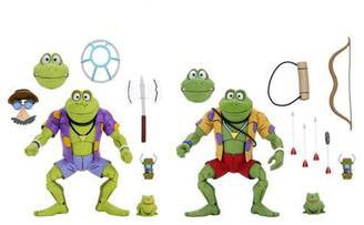 Designed to be Shredder's amphibian counterparts to the turtles, the long-awaited Punk Frogs are uniting with the heroes in a half shell, starting with Genghis and Rasputin! Crammed with accessories, this 2 pack comes with interchangeable heads and hands, a bow and arrow, quiver, ax, disguise glasses, mini frogs, communicators, and more! Comes in collector-friendly window box packaging.