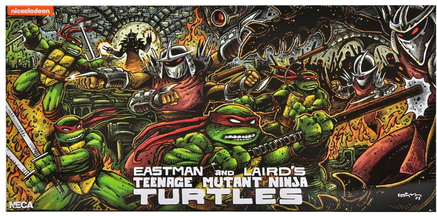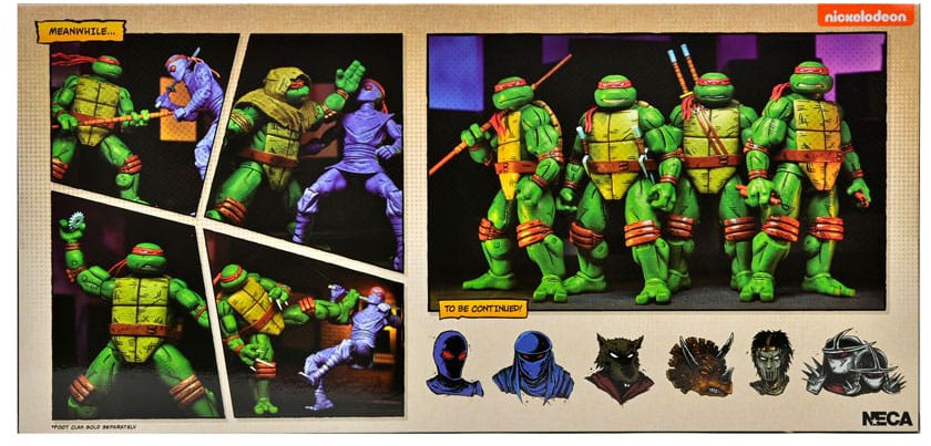 Based on the "Return to New York" storyline in Eastman & Laird's Teenage Mutant Ninja Turtles comic books from Mirage Studios! These 7" scale action figures feature all new sculpts and are fully articulated for great ninja poses. Leonardo, Raphael, Michelangelo, and Donatello are loaded with accessories including cloak, bo staff, sais, nunchucks, swords, ninja stars, interchangeable bandaged arm, extra hands, and extra mask ties! Comes in special comic-book themed window box packaging with amazing new artwork by Kevin Eastman.