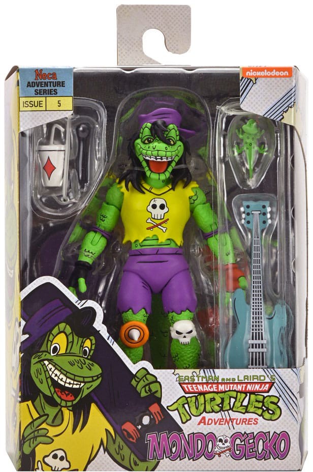 Det här är den definitiva Mondo Gecko till din TMNT-samling! Den här actionfiguren är direkt hämtad från Eastman och Lairds serietidningsserie Teenage Mutant Ninja Turtles Adventures från Archie Comics! Mondo Gecko har lämnat musikbranschen för att ansluta sig till Turtles i deras strävan att göra gott! Denna mäktiga mutanimal kommer med en massa tillbehör, inklusive extra händer, skateboard, gitarr, gecko som husdjur, läskmugg och mikrofon! Levereras i en samlarvänlig fönsterförpackning och har helt nya illustrationer av den ursprungliga TMNT-serietecknaren Ken Mitchroney.
