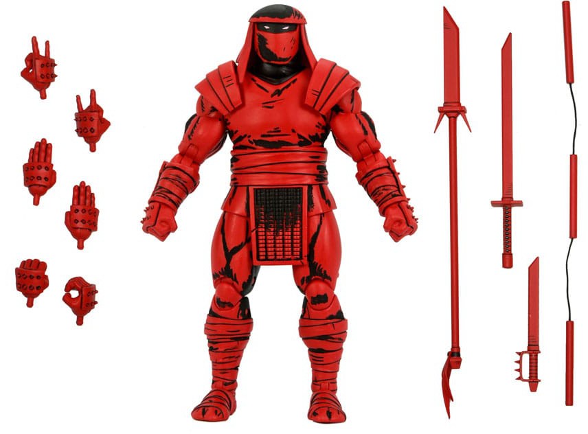 Den här Foot Enforcer-actionfiguren har en spännande ny röd och svart färgskala. Den innehåller en tredelad stav, ninjato, fjärilssvärd, naginata och fyra uppsättningar utbytbara händer. Detta NECA samlarobjekt levereras i en speciell fönsterförpackning med serietidningstema illustrerad av Kevin Eastman.