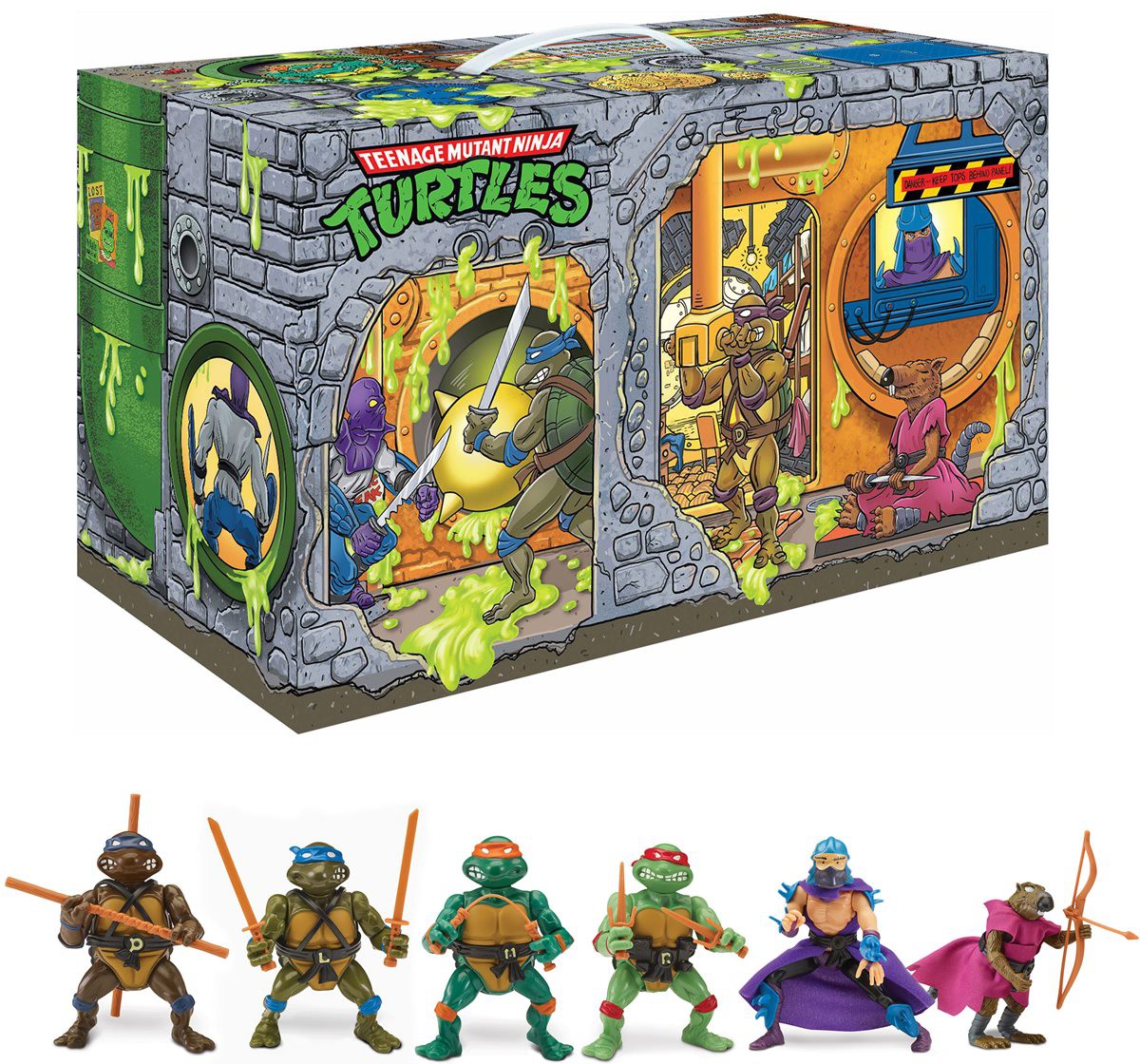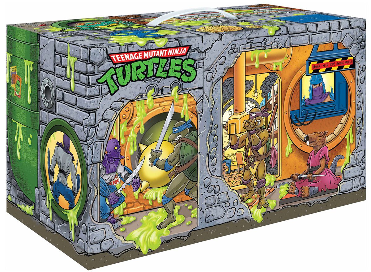Cowabunga, dude! The Teenage Mutant Ninja Turtles are back with Playmates' Retro Rotocast Sewer Lair Figure Set! The figures in this 6-piece set feature original bodies with authentic decoration from the 1980s action figures and oversized roto heads. The Turtles have their individual Bandana colors and include the letters designated on their belts and weapons rack. Each figure comes individually packed out in blister card with authentic class Turtles logo and graphics! Figures include Leonardo, Donatello, Michelangelo, Raphael, Shredder, and Splinter, all wrapped in a soft package inspired by the Ninja Turtles' Sewer Lair!