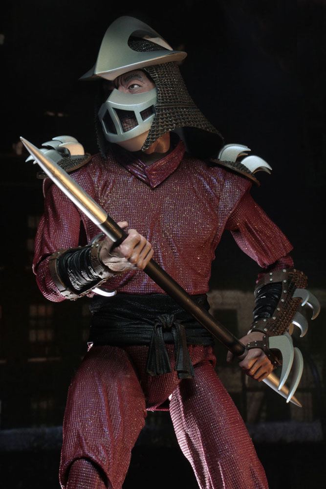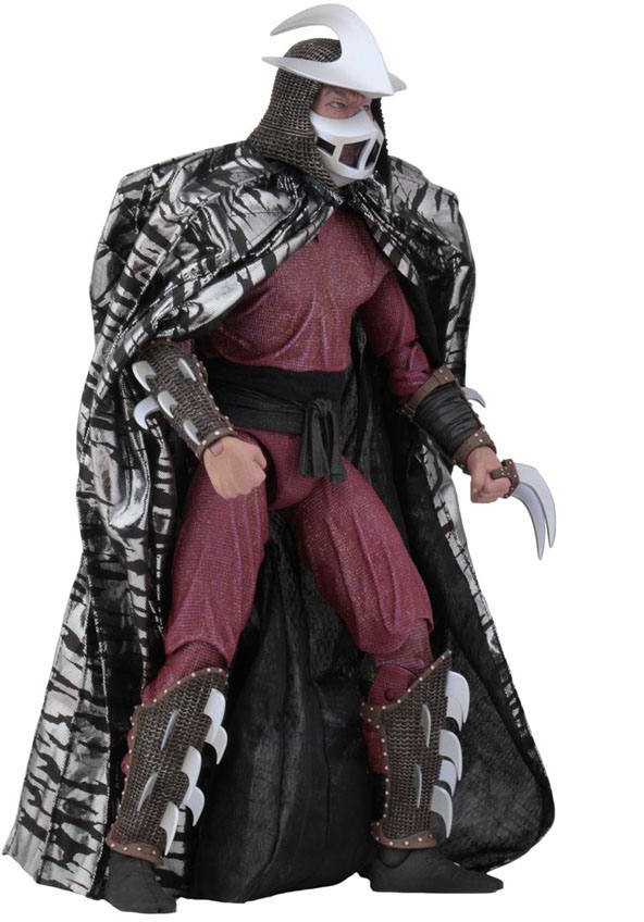 Denna mycket detaljerade actionfigur är 46 cm lång och har 30 artikuleringspunkter, inklusive dubbla armbågar, för att visa upp Shredders färdigheter. Shredder levereras med en löstagbar tygkappa, avtagbar mask, spjut och kniv med mantel.