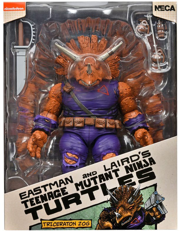 Based on the original Eastman & Laird Teenage Mutant Ninja Turtles comic books from Mirage Studios! It's terror in the sewers for anyone unlucky enough to come across Zog, a Triceraton soldier who fled to the tunnels after escaping the TCRI research building. The deluxe figure is almost 8" tall, and includes extra hands, blaster, grenades, and machete! Comes in all new special comic-book themed window box packaging illustrated by Kevin Eastman.