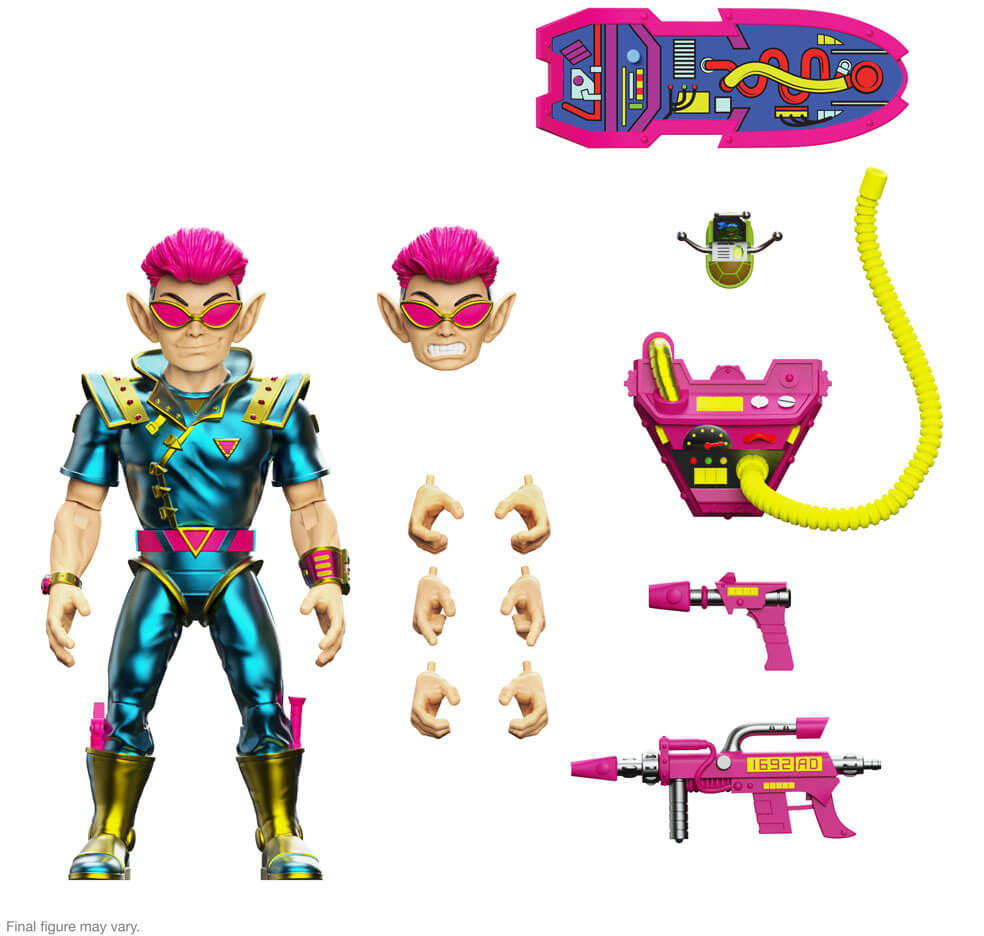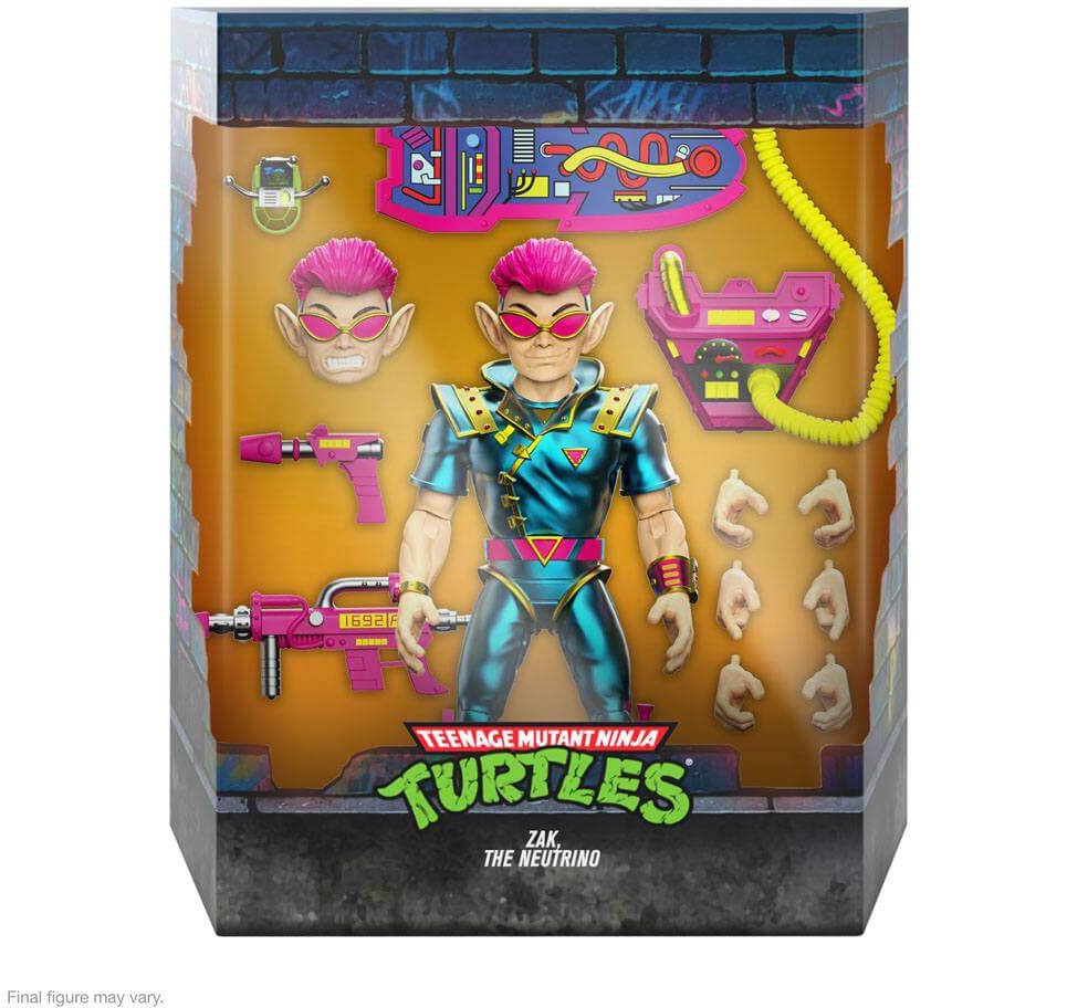 Zak and the rest of the Neutrinos from Dimension X just want to have a good time because he's not just cool, Daddio. This hip cat is FROZEN! This 7" scale Teenage Mutant Ninja Turtles ULTIMATES! figure of Zak, the Neutrino features multiple interchangeable heads & hands and a variety of accessories, including a hoverboard, Turtle Communicator, blasters (required by Dimension X law), and a Power pack! The Ninja Turtles and their friends are all about having a good time and what could be more fun than adding the made-to-order TMNT ULTIMATES! figure of Zak, the Neutrino to your collection!