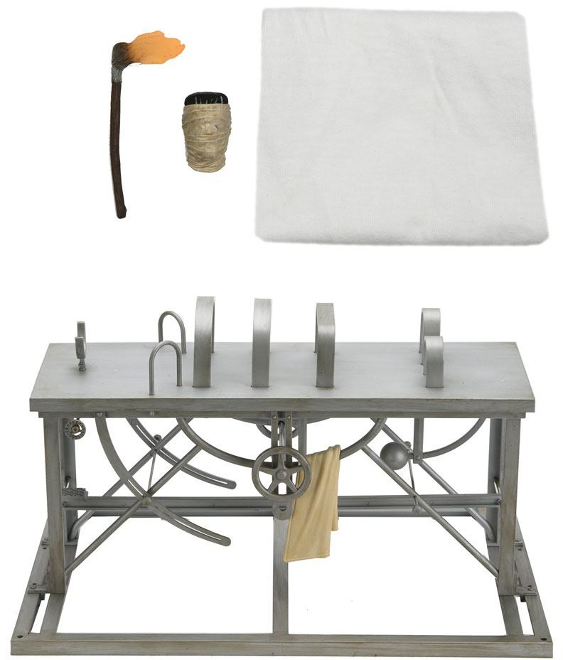 Build even bigger scenes and dioramas with this accessory set for NECA's Universal Monsters Frankenstein's Monster action figure! Accurate to the movie, the centerpiece of the set is the massive laboratory table, which measures over 9.5" inches long and over 6" wide and fits the NECA action figure (sold separately). The set also includes an additional bandaged head for the Monster, cloth, and a torch accessory. Closed box packaging.