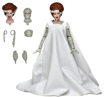 The debut of Universal's 1935 film The Bride of Frankenstein promised audiences something "more fearful than the monster himself"! Elsa Lanchester's portrayal of the creature stitched together to be the monster's mate is captured in this detailed 7" scale Ultimate action figure. It comes with bandages, removable gown, two pairs of hands, and three interchangeable head sculpts. Display-friendly window box packaging with opening front flap.