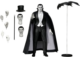 NECA announces a new Ultimate action figure of the most famous vampire of them all... Dracula! Following the color version, we've created a special black-and-white figure that features the formal tuxedo seen at his Carfax estate. We worked closely with the estate of Bela Lugosi to capture the actor's expressive likeness and for additional background detail on important costume elements. Standing in 7" scale, the Ultimate Dracula (Carfax Abbey) action figure has a removable soft goods cape and comes with plenty of accessories: top hat, cane, bat, flight stand, plus three interchangeable heads and hands. Includes additional neck piece making it compatible with the heads from the color version. Display-friendly window box packaging with opening front flap.