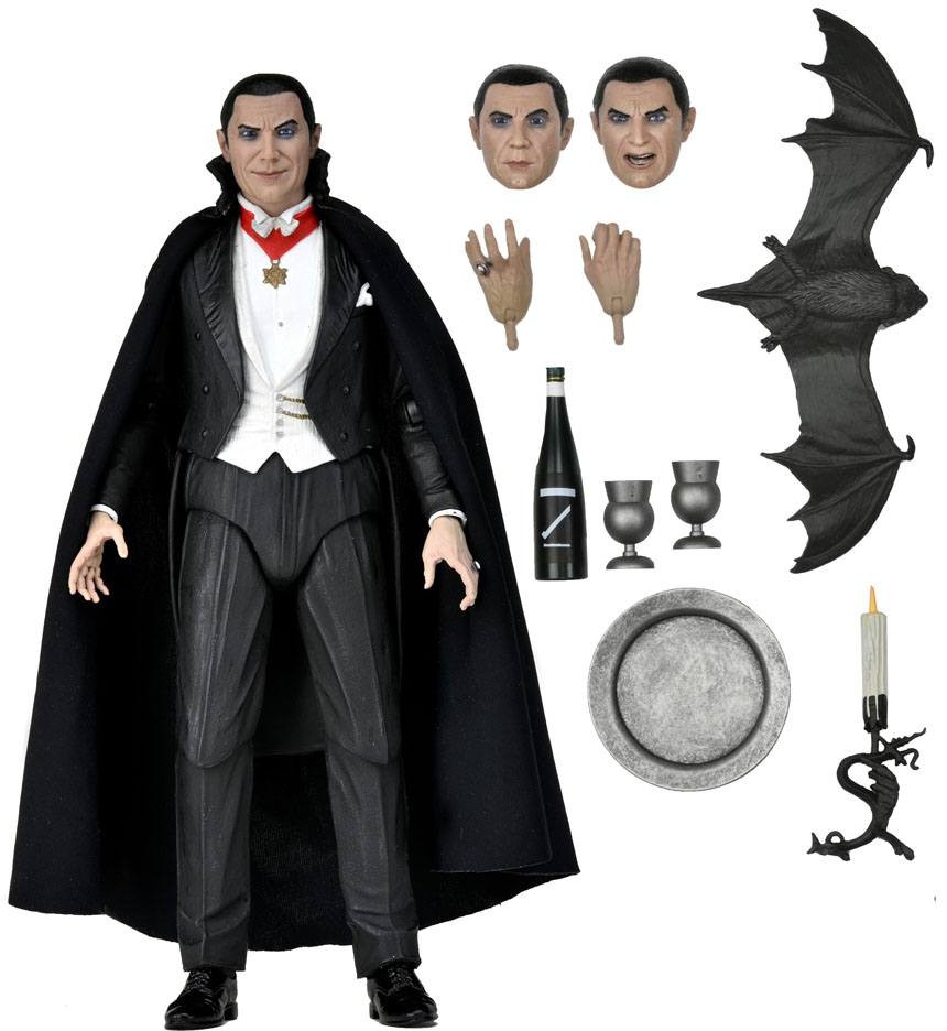 To celebrate the 90th anniversary of Universal Monsters' acclaimed silver-screen classic, NECA announces an Ultimate action figure of the most famous vampire of them all... Dracula! We worked closely with the estate of Bela Lugosi to capture the actor's expressive likeness in three different head sculpts, and for additional background detail on important costume elements. Standing in 7" scale, the Ultimate Dracula (Transylvania) action figure has a soft goods cape and comes in premium anniversary packaging with plenty of accessories: 3 interchangeable heads, interchangeable hands, large bat, wine bottle, goblets, candlestick and serving plate.