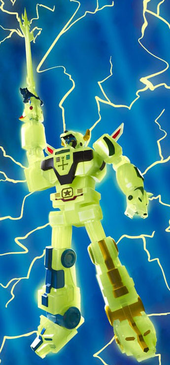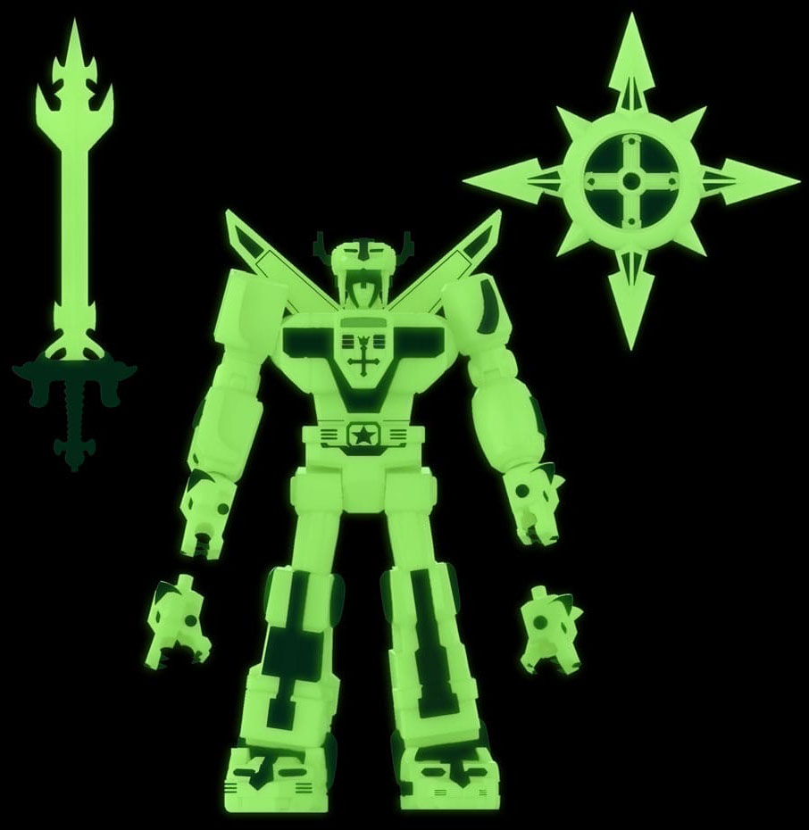 Voltron is a beacon of hope in a galaxy tormented by the Drule Empire, and the mighty robot never shines brighter than when revealing its Blazing Sword! This highly articulated 7" scale Voltron ULTIMATES! Lightning Glow Voltron is inspired by the moment that Voltron forms the Blazing Sword and is illuminated by a burst of lightning. Constructed from glow-in-the-dark material, featuring intricate sculpting, premium paint detail, and interchangeable "hand" Lion heads, as well as glow-in-the-dark shield and Blazing Sword accessories. Let this made-to-order, glow-in-the-dark Voltron ULTIMATES! Lightning Glow Voltron illuminates your collection day and night!