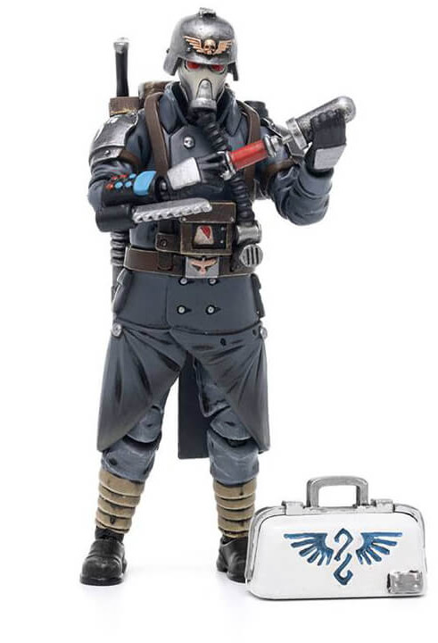 Joy Toy väcker liv i Death Korps of Krieg Veteran Squad Guardsman Medic med denna fullt rörliga Warhammer actionfigur i skala 1/18. Varje figur inkluderar utbytbara händer och vapen.