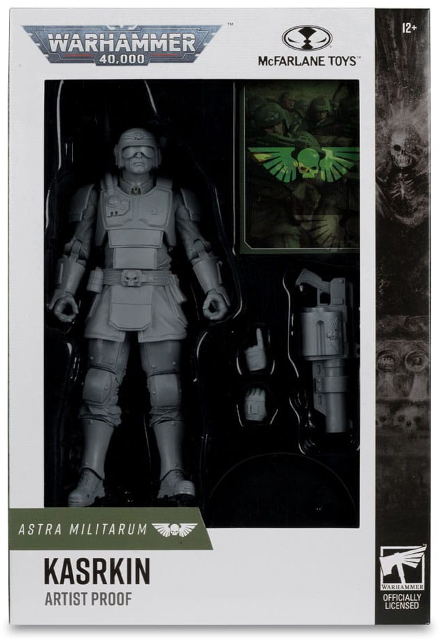 - Figuren visas upp i en fönsterförpackning med Warhammer 40 000-tema