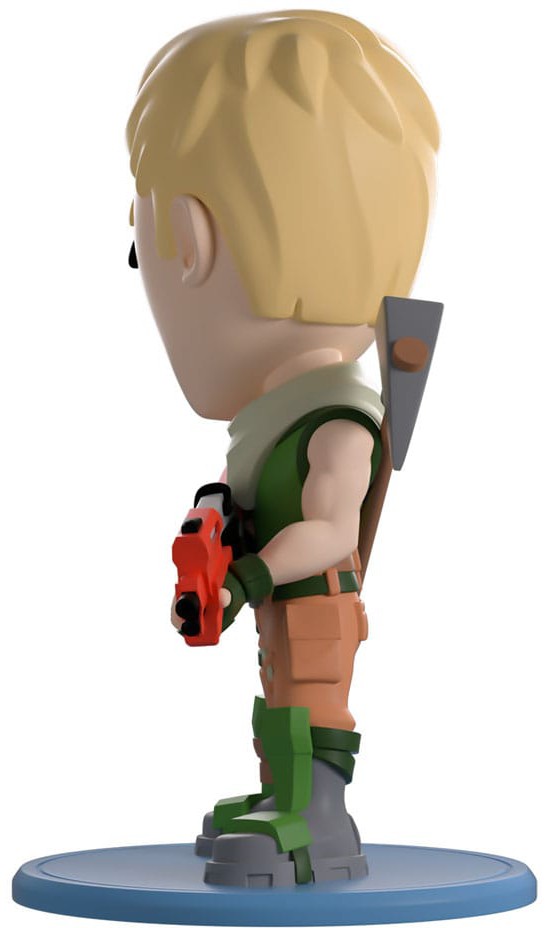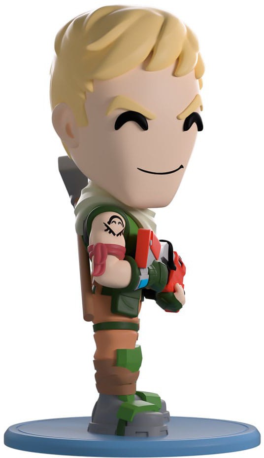 Standing at 4.9 inches tall and looking over his shoulder with a confident smirk crossing his face, short blonde hair sweeps forward as he holds a Legendary orange tactical shotgun to his front.