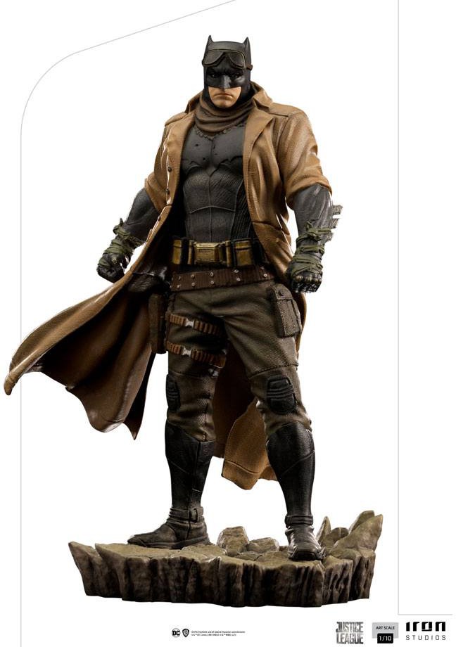 In an apocalyptic desert where it was once a planet full of life, a tired and cautious, but still relentless leader of an insurgent movement, walks in a devastated world, seeking by all means to end a long conflict against the conquering forces of a cosmic tyrant and his Kryptonian ally, who was once Earth's greatest hero. Wearing an overcoat over a stiffer variation of his original costume, Iron Studios presents the "Knightmare Batman - Zack Snyder's Justice League - Art Scale 1/10" statue, featuring the Dark Knight derived from the anthological scene presented in the film's side plot Justice League, in director Zack Snyder's version.