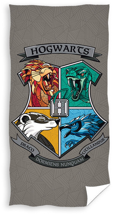 Grå handduk med motiv av Hogwarts husen.