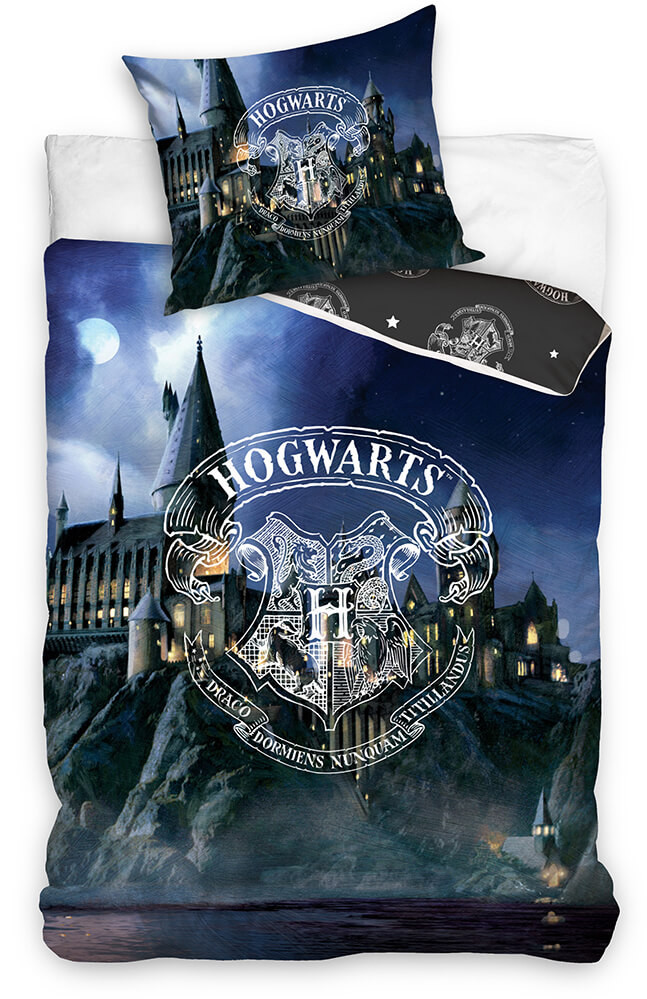 Harry Potter sängkläder. Stilrent bäddset med Harry Potter tema, Hogwarts skolan i bakgrunden med vapenskölden i vitt.