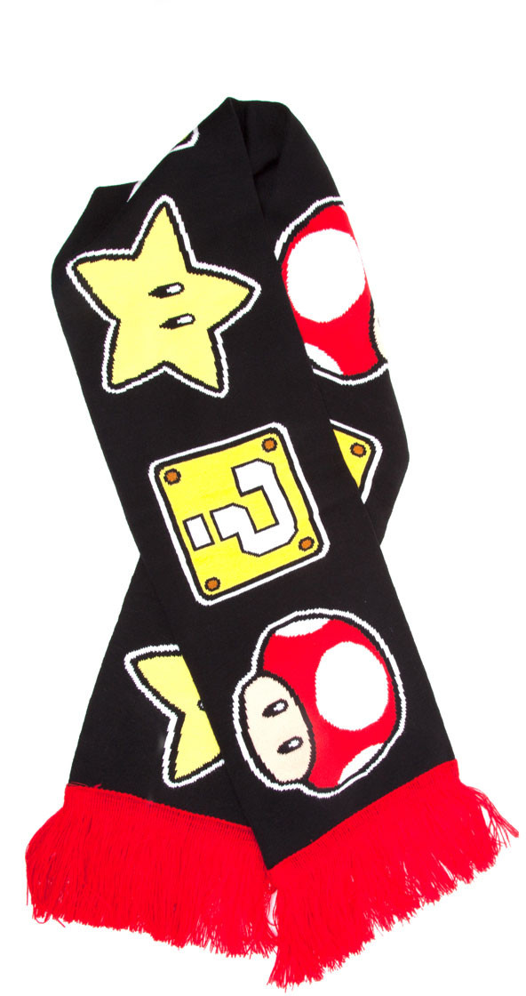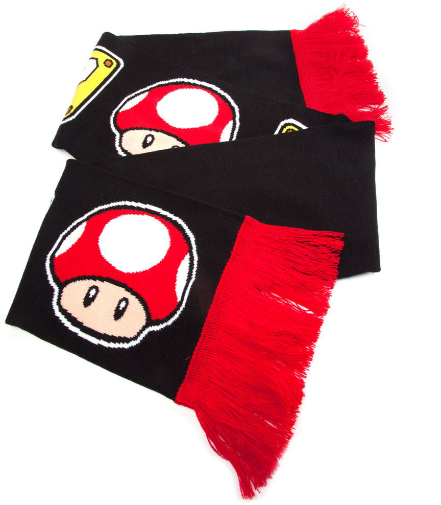 Härlig Super Mario halsduk med svamp, stjärna och frågetecken.