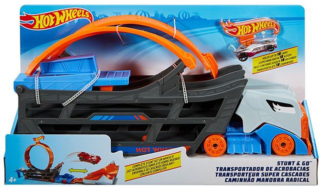 The Stunt & Go transforming transporter is totally portable for stunting action anywhere, anytime! Fold the entire play set back up, load your cars in the truck bed and roll off until your next Hot Wheels stunt show. Colors and decorations may vary.