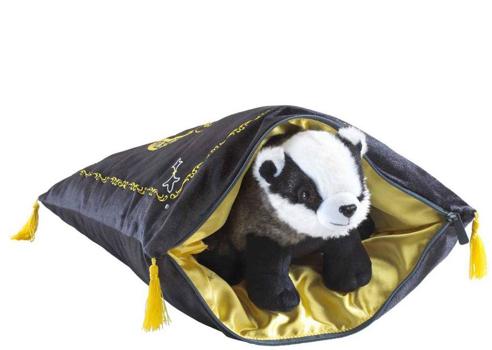 Harry Potter kudde med Hufflepuffmotiv och tillhörande gosedjur.