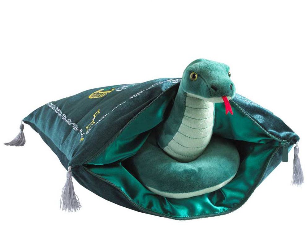 Harry Potter kudde med Slytherinmotiv och tillhörande gosedjur.