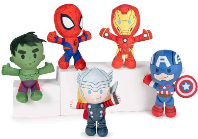 Assortment of officially licensed Marvel plush figures approx. 19 cm tall. Spider-Man, Iron Man, Hulk, Captain America and Thor.