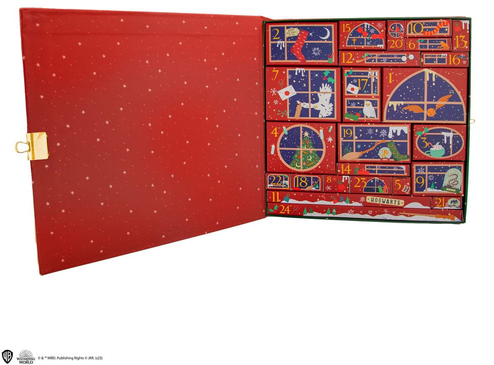Officiellt licensierad Harry Potter-julkalender med 24 föremål (tygkasse, pin, halsband, handskar, jojo, strumpor, crossbody-väska, armband, underlägg, klistermärken, lenticular pin-märke, kakform, pussel, ögonmask, minnesblock, nyckelring, dragsko, skummagnet, gomee, trollstavspenna, mylarballong, återanvändningsbart sugrör, spegel)
