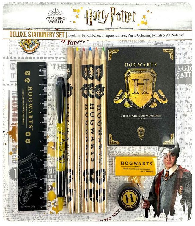 Straight from the ´Harry Potter´ movies comes this cool deluxe stationery set. It features a pencil, ruler, sharpener, eraser, pen, 5 colouring pencils and A7 Notepad.