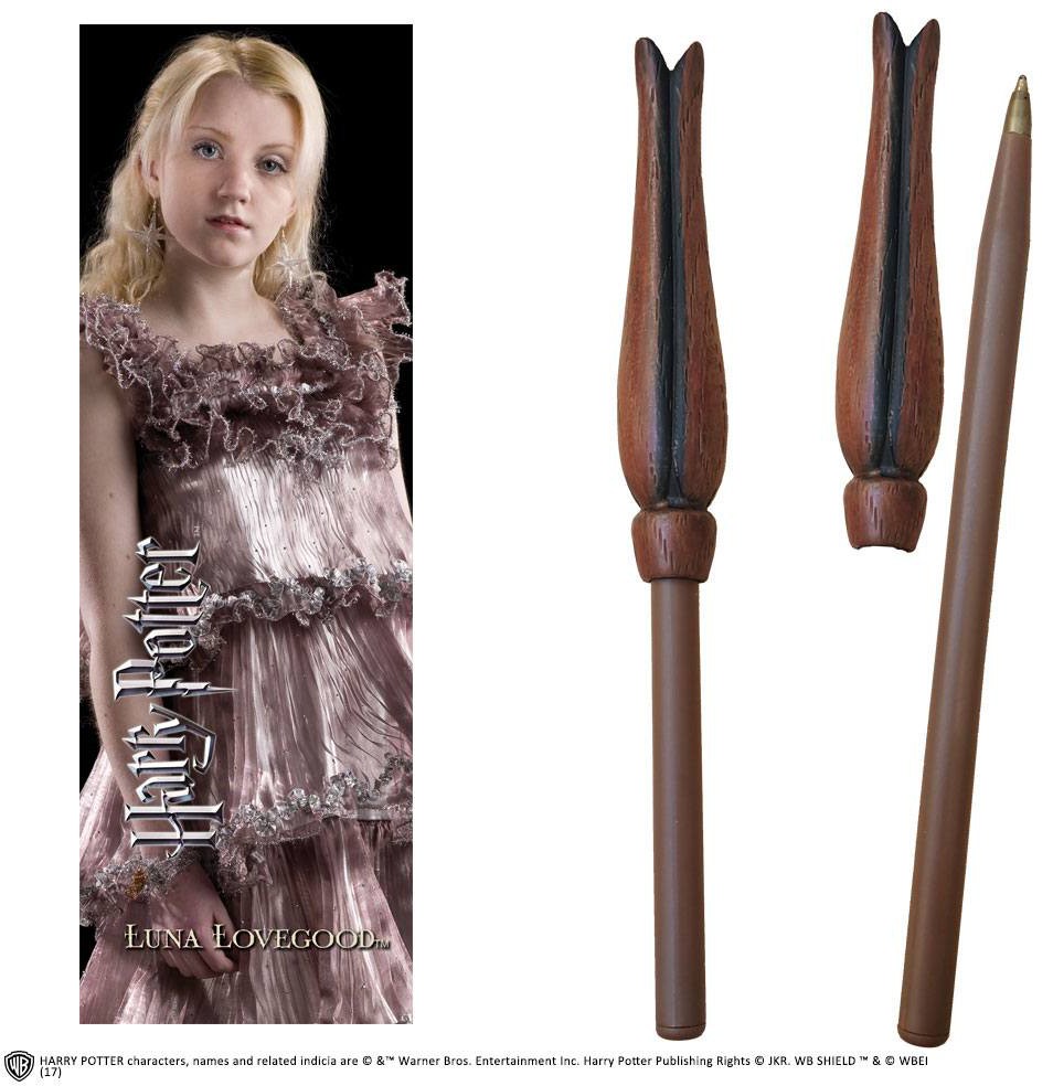 Harry Potter penna i form av Lunas trollstav tillsammans med ett Harry potter bokmärke.