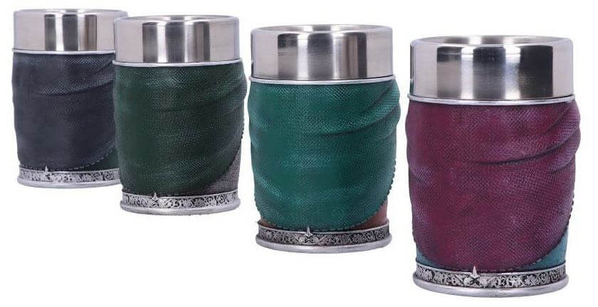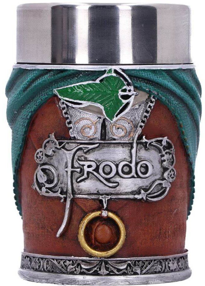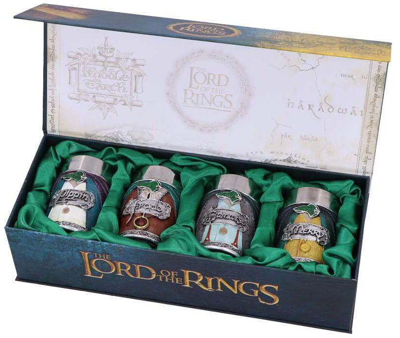Fyra shotglas gjord av resin och rostfritt stål. Varje glas har en design för att påminna om Frodo, Samwise, Merry och Pippin