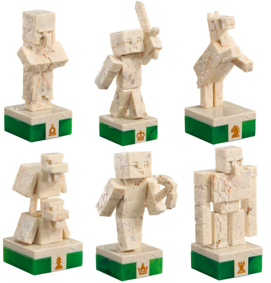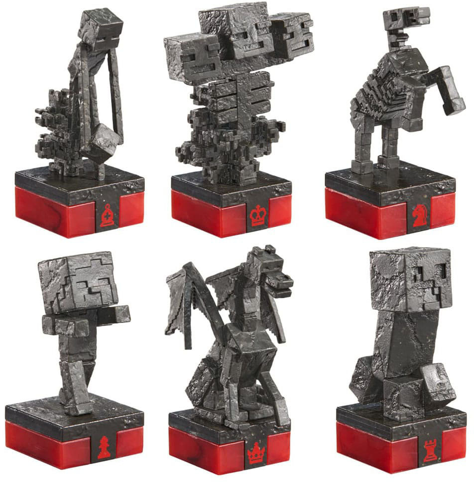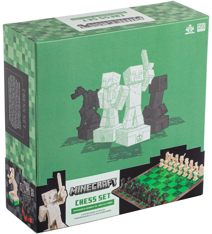 The 18" square chess board comes as four interlocking quadrants and features a wood-like frame around a playing surface of ''grass' in textured shades of green. This set includes 32 game pieces with textures and finishes that resemble marbled stone, obsidian, redstone or emerald - play as the friendly Overworld characters or take the side of the dark hostile mobs.