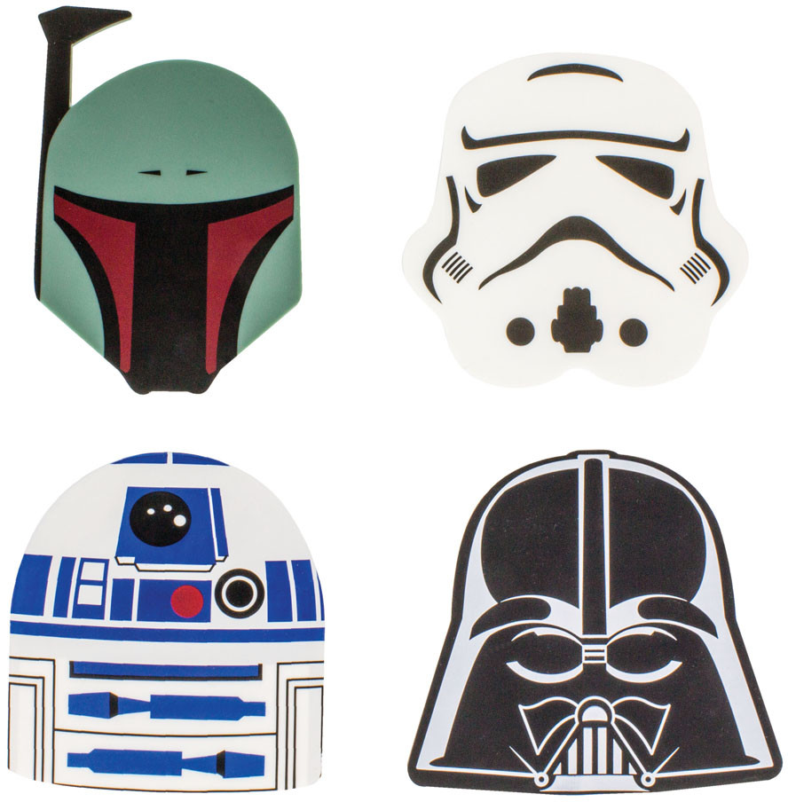 Fyra stycken underlägg i silikon med Star Wars-motiv. Darth Vader, Boba Fett, R2-D2 och en Stormtrooper.