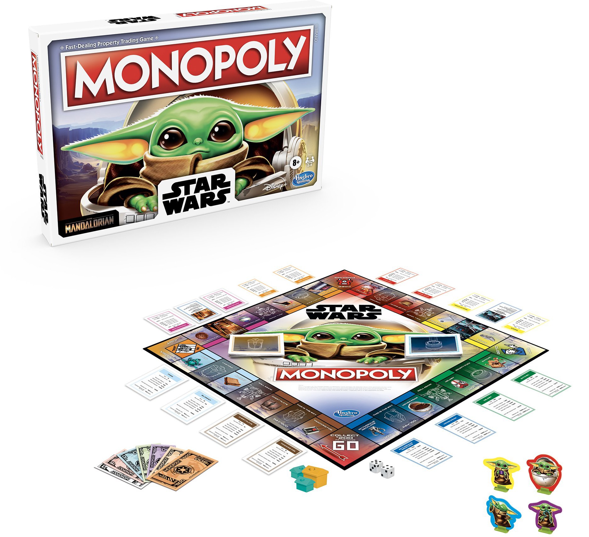 Imagine traveling around the galaxy with The Child, or affectionately known as "Baby Yoda" by fans. This Monopoly: Star Wars The Child edition board game features themes and artwork inspired by The Mandalorian live-action TV series on Disney Plus. Move around the gameboard as The Child, buy and sell Hideouts and Common Houses, and follow the actions on the Camtono cards and Bounty Puck cards. The last player remaining after everyone else has gone bankrupt wins the game!