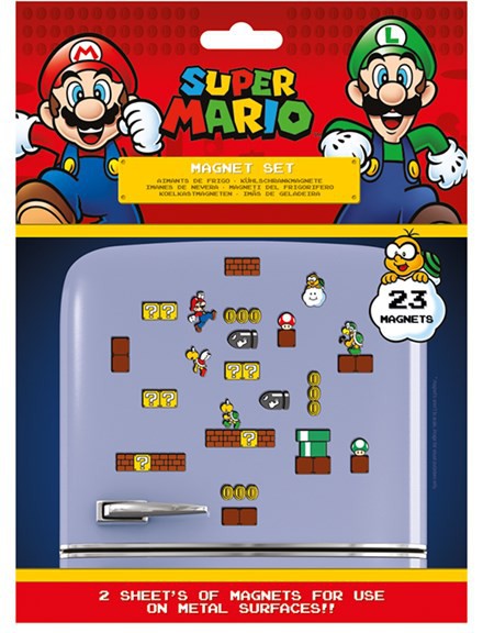 Super Mario fridge magnet set. Build your own level with blocks, power ups, coins, enemies and more! The set contains 23 magnets.
