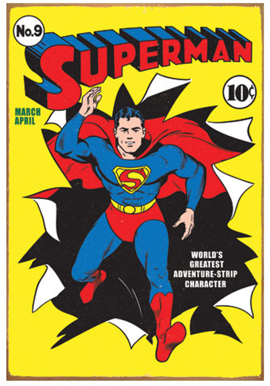 Own your own vintage Superman tin sign. Taken straight from one of the original Superman comic books, this is a great decoration to have, especially if you are a fan of the early Superman's. The picture is from the actual Superman #9 cover published by DC Comics.