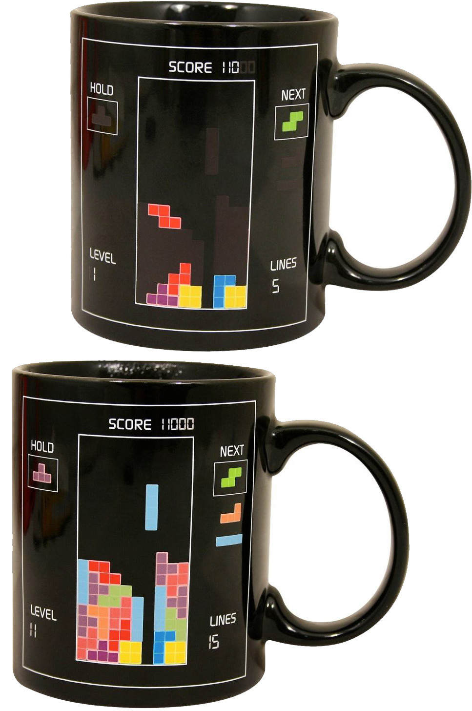This stylish black mug features a snapshot of a Tetris game at the beginning of play when cold. Fill the mug with your choice of hot beverage and the face of the mug immediately changes to show the game in a much more advanced state of play.