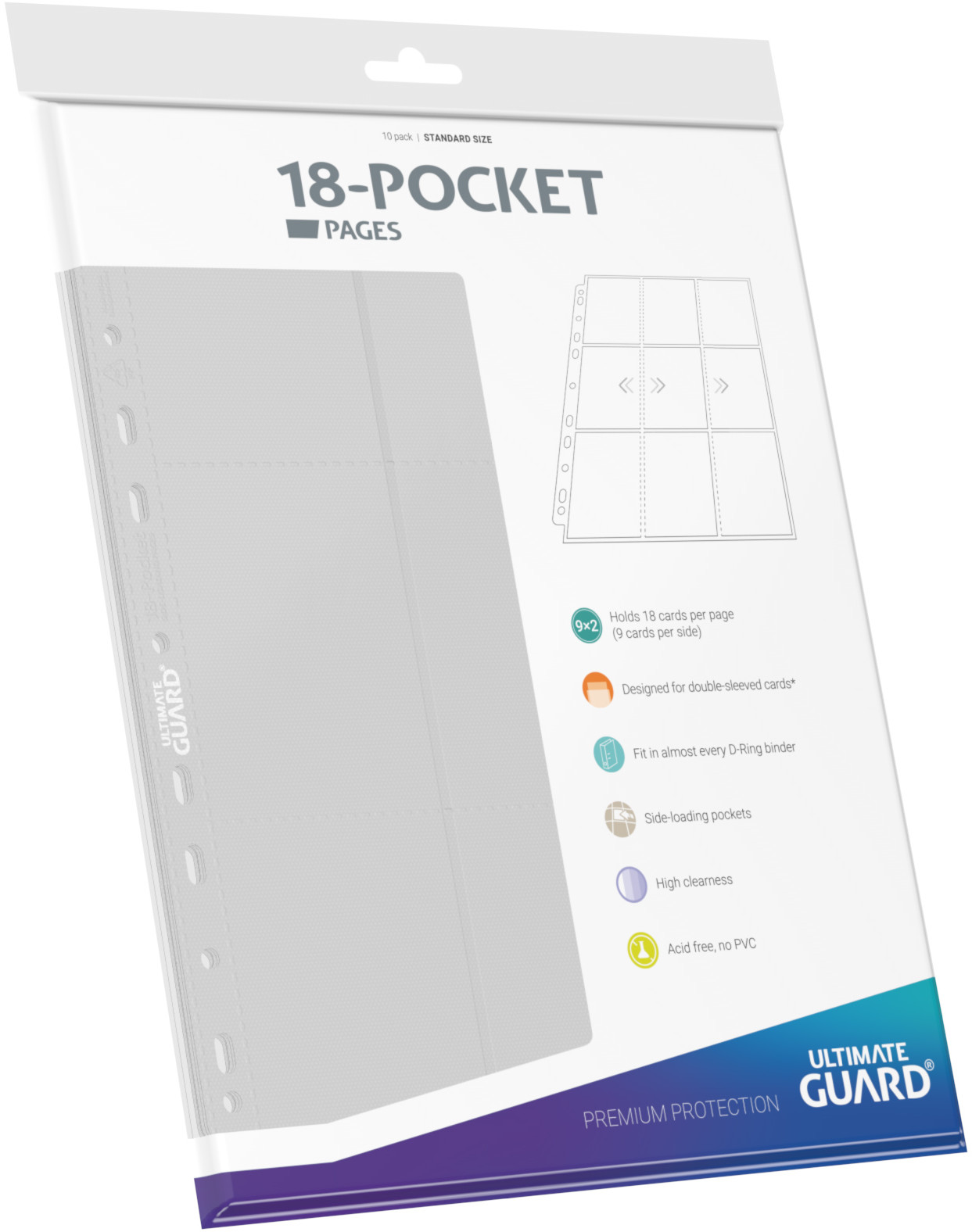 High-quality, double-sided pocket pages (18 pockets, 9 pockets each on front and back side), that fit in almost any D-Ring-Binder, thanks to the double reinforced 11-hole strip. Each pack contains 10 pages for storing and carrying at least 180 double-sleeved cards (18 per page).