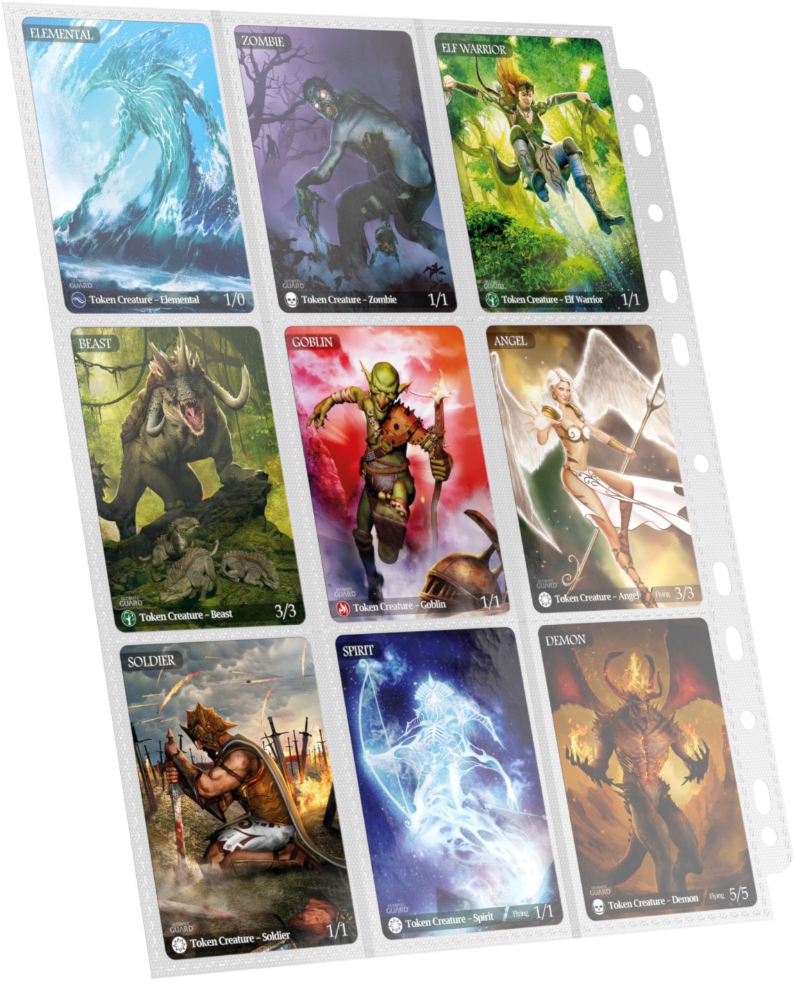 Dubbelsidiga ficksidor av hög kvalitet (18 fickor, 9 fickor vardera på framsidan och baksidan), som passar i nästan alla D-ringbindare tack vare den dubbla förstärkta 11-hålsremsan. Varje förpackning innehåller 10 sidor för förvaring och bärning av minst 180 kortärmade kort (18 per sida).