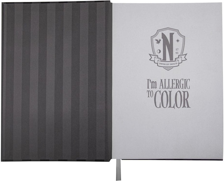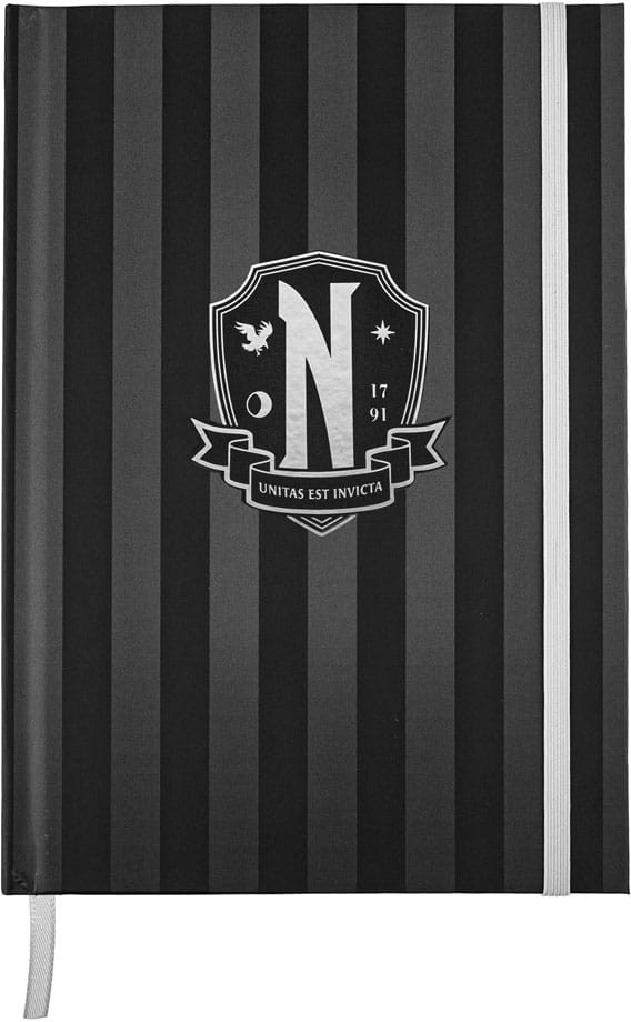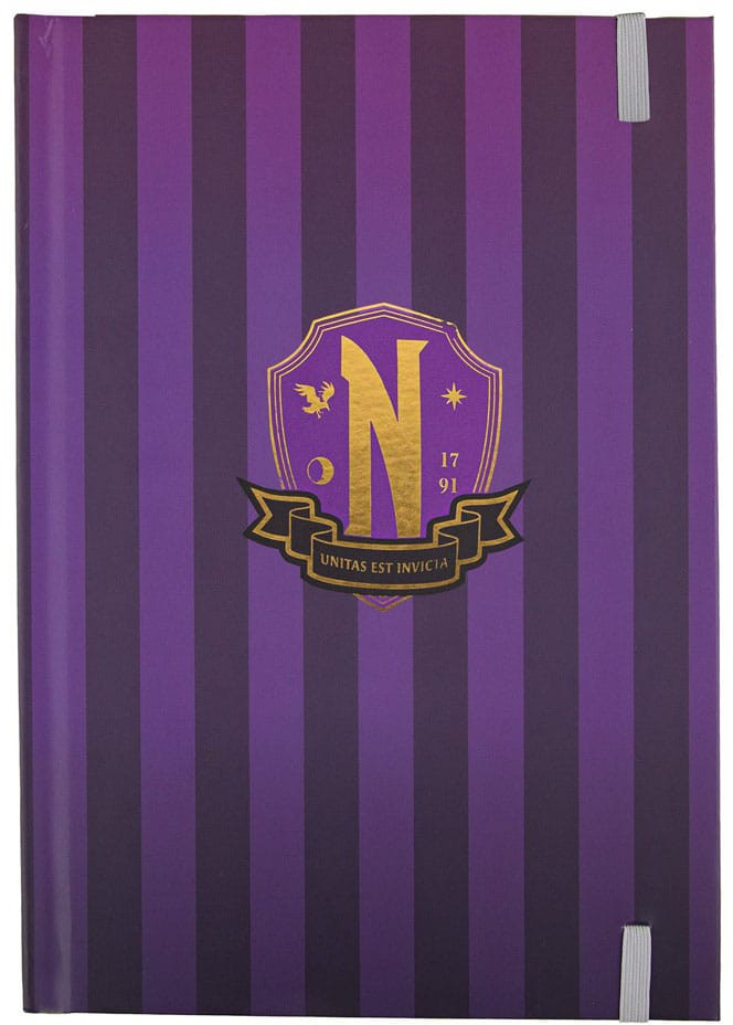 Både framsidan och baksidan av anteckningsboken pryds av den ikoniska logotypen för Nevermore Academy i mitten, men med en unik twist. Framsidan visar skolans logotyp i en elegant svart och grå färgskala, som Wednesdays uniform, medan baksidan visar akademins faktiska färger - lila och guld. Vänta inte med att börja utforska djupen i din fantasi!