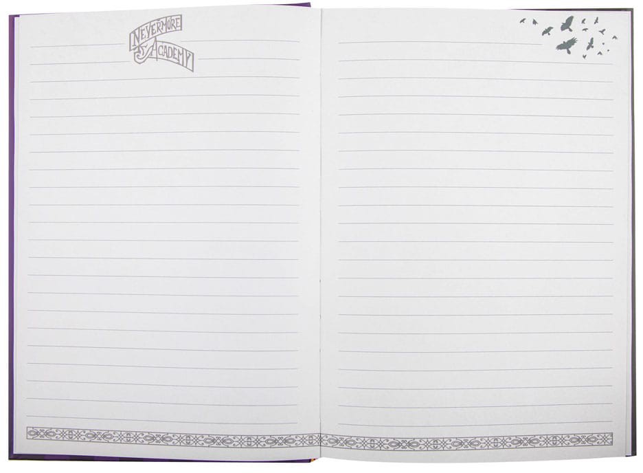 Both the front and back covers of this notebook are adorned with the iconic nevermore academy logo in the centre, but with a unique twist. The front cover showcases the school logo in a sleek black and grey colour scheme, like Wednesday's uniform, while the back cover features the actual colours of the academy - purple and gold. Don't wait up to start exploring the depths of your imagination!