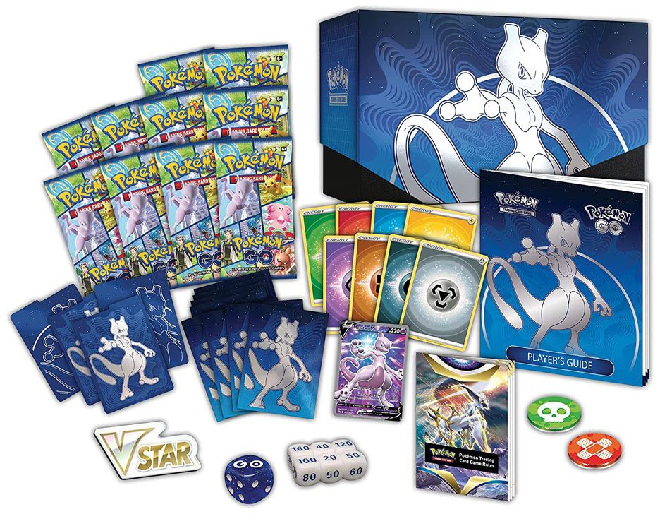 Gear up for battle like never before as Pokémon GO meets the Pokémon Trading Card Game! The Pokémon TCG: Pokémon GO Elite Trainer Box is a great way to get started with this exciting new expansion thanks to the ten Pokémon TCG: Pokémon GO booster packs included. Not only that, but you'll get a foil promo card featuring Mewtwo V. This Legendary Pokémon's Transfer Break attack will do 160 damage to your opponent's Active Pokémon while moving one Energy attached to Mewtwo V onto one of your Benched Pokémon. This Elite Trainer Box also includes plenty of other useful items for playing the Pokémon TCG. There are 65 card sleeves featuring Mewtwo to keep your deck in good condition, 45 Energy cards to power up your team, damage-counter dice and a coin-flip die, acrylic condition and VSTAR markers, and a player's guide to the Pokémon GO expansion. It all comes in a sturdy collector's box that's perfect for storing your cards. You'll be ready to go with this cool set!