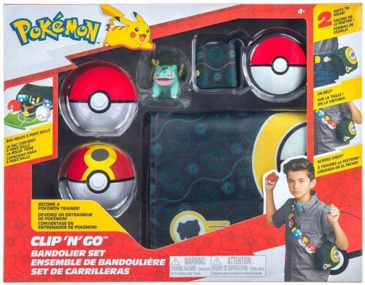 Get ready to become a Pokémon Trainer! The Clip 'N' Go Pokéball Bandolier set includes one adjustable belt, two Poké Balls, shoulder bag and one 5 cm figure. Belt / bag can hold up to six Poké Balls at once.